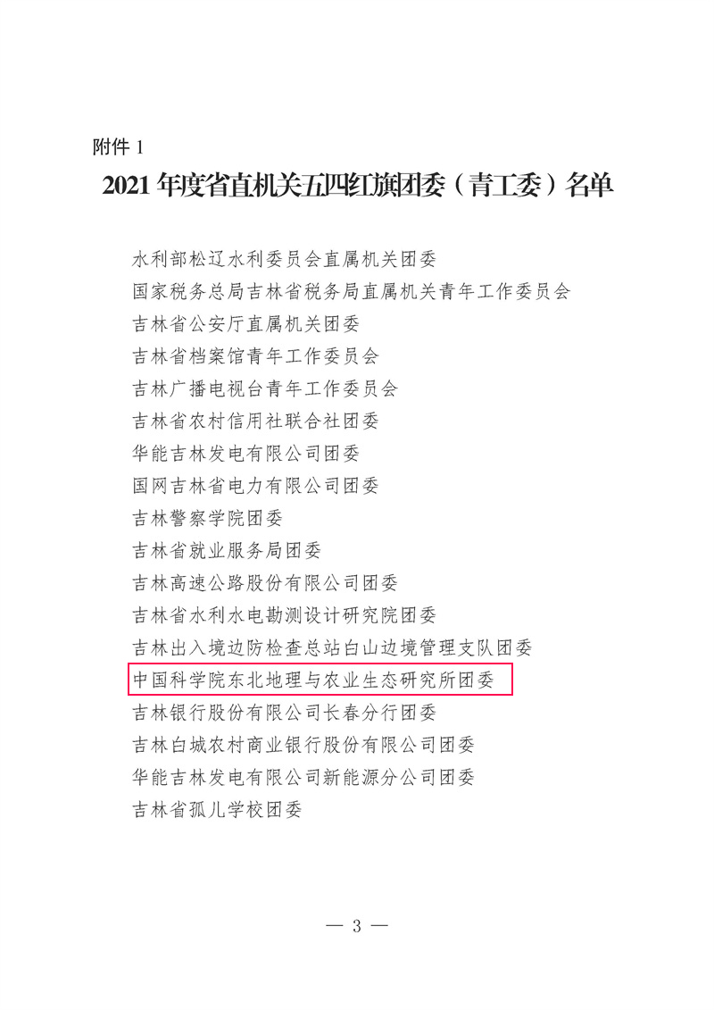 為表揚(yáng)先進(jìn),激勵(lì)團(tuán)青組織和廣大團(tuán)員青年奮發(fā)有為、再創(chuàng)佳績(jī),省直機(jī)關(guān)團(tuán)工委對(duì)18個(gè)五四紅旗團(tuán)委(青工委)、24個(gè)五四紅旗團(tuán)支部、33名優(yōu)秀團(tuán)干部、100名優(yōu)秀團(tuán)員青年進(jìn)行通報(bào)表揚(yáng)。中國(guó)科學(xué)院東北地理與農(nóng)業(yè)生態(tài)研究所團(tuán)委榮獲“2021年度省直機(jī)關(guān)五四紅旗團(tuán)委”稱號(hào),2020級(jí)博士研究生楊光義、2019級(jí)碩士研究生梁曉璇、2021級(jí)博士研究生馮明銘榮獲“省直機(jī)關(guān)優(yōu)秀團(tuán)員”稱號(hào)。