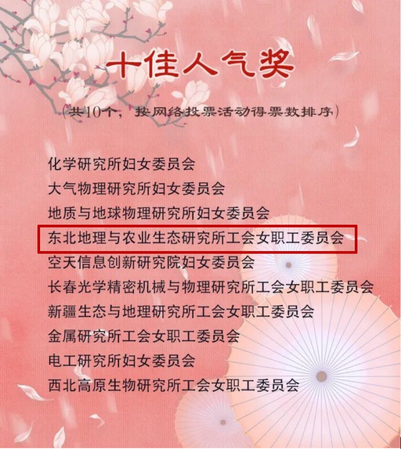 7月7日,中國科學院婦女工作委員會、中國科學院工會女職工委員會公布了2022年“科苑女性活動月”獲獎名單,在全院各級婦女組織中,評選出優秀組織獎33個,十佳人氣獎10個。其中東北地理與農業生態研究所工會女職工委員會榮獲"優秀組織獎"和"十佳人氣獎"。
