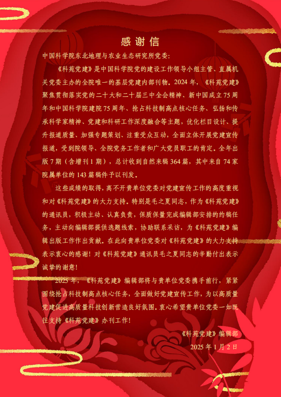 近日,東北地理所收到《科苑黨建》發來的感謝信,感謝所黨委對黨建宣傳工作的高度重視和對《科苑黨建》的大力支持,對《科苑黨建》通訊員的辛勤付出表示誠摯的謝意!