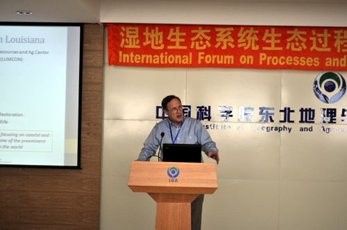 7月29日上午進(jìn)行了會議開幕式和大會學(xué)術(shù)報(bào)告。開幕式由中國科學(xué)院濕地生態(tài)與環(huán)境重點(diǎn)實(shí)驗(yàn)室呂憲國主任主持,我所劉興土院士、何興元所長分別致辭。中國科學(xué)院濕地研究中心副主任劉興土院士簡要介紹了當(dāng)前濕地學(xué)科的進(jìn)展和存在的關(guān)鍵科學(xué)問題,并對于濕地學(xué)科寄予了美好的期望,希望借此次國際會議,世界各地的科技工作者充分交流,共同為保護(hù)濕地、利用濕地做出應(yīng)有的貢獻(xiàn)。何興元所長代表我所對所有參會人員的到來表示歡迎,希望借本次會議增進(jìn)濕地學(xué)科的國際合作與交流,他還簡要介紹了我所的基本情況及我所濕地學(xué)科的人員情況、科研成果及發(fā)展?fàn)顩r等。應(yīng)會議邀請,國家林業(yè)局濕地保護(hù)管理中心馬廣仁主任、吉林省林業(yè)廳喬恒副廳長、劉興土院士、路易斯安那州立大學(xué)海岸環(huán)境學(xué)院Christopher F D'Elia院長分別以“濕地生態(tài)系統(tǒng)保護(hù)管理”“吉林省濕地保護(hù)與資源綜合利用”“退化濕地恢復(fù)—葦蟹(魚)稻生態(tài)恢復(fù)工程”“路易斯安那州濕地科學(xué)與教育”為題作了大會主題報(bào)告。