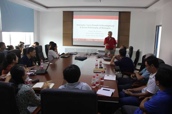 Al-Kaisi和Elmore分別做了題為“Improving Soil Management Practices for Efficient Water Processing,Nutrient Storage,and Soil Functions”和“Nebraska,Corn Growth & Development & Some Philosophy of Research”精彩報告。Al-Kaisi介紹了土壤耕作方式和作物輪作系統(tǒng)對土壤功能的影響,重點分析了土壤有機質動態(tài)、水分入滲、土壤結構穩(wěn)定性及微生物量對其的響應,強調了在土壤管理過程中輪作和秸稈還田對土壤質量的重要性。愛荷華州位于美國的中西部,是美國重要的玉米和大豆產區(qū),具有與我國東北地區(qū)相同的土壤黑土類型。因此,Al-Kaisi的報告對于我們研究所正在開展黑土研究工作具有重要的借鑒作用。Elmore的報告主要涉及了不同管理方式及氣候條件對玉米生長的影響,重點介紹了玉米不同生育時期的生長發(fā)育對其籽粒產量形成的貢獻;同時,Elmore分享了其在美國開展農業(yè)技術推廣工作的經(jīng)驗,這對我們開展農業(yè)技術推廣具有一定的指導意義。此次學術交流為參會師生提供了一次擴寬的研究思路和國際視野的機會。