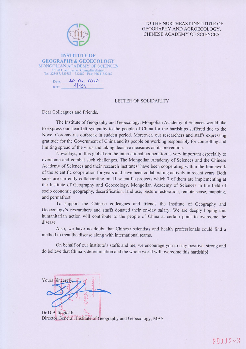 2月20日,蒙古科學(xué)院地理與地球生態(tài)研究所在新型冠狀病毒肺炎疫情爆發(fā)后,向東北地理所發(fā)來慰問信,并組織全所職工捐款。來信充分展示了我所與蒙古科學(xué)院地理所患難見真情的深厚合作關(guān)系。