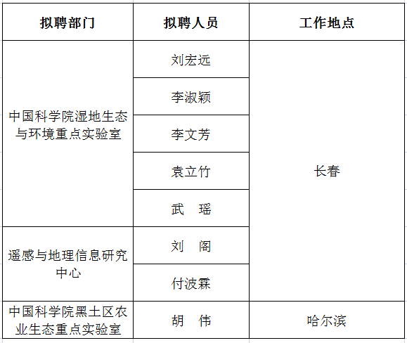 依據東北地理所公開招聘程序,在公開申報、資格審查、競聘答辯、設崗招聘委員會考察評議與建議的基礎上,經所領導班子集體研究決定,擬聘任劉宏遠等8名同志來所工作,現將各崗位的擬聘人選予以公示:
