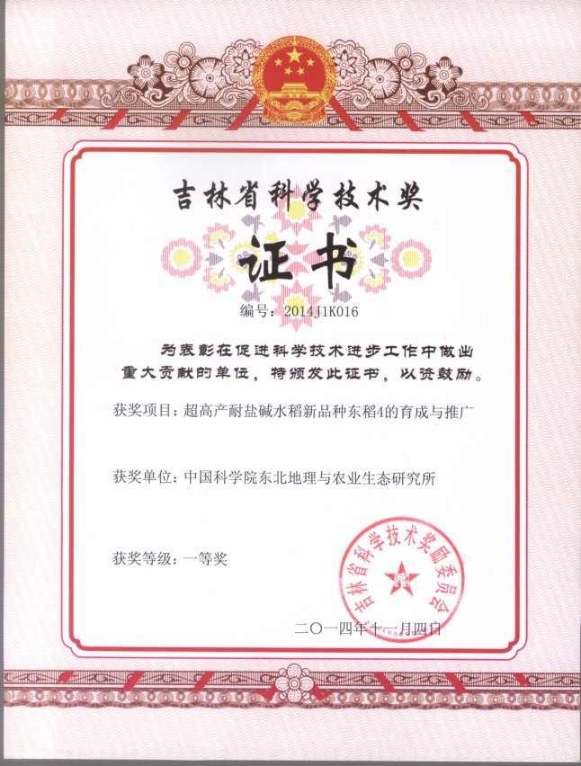 重點培育三“蘇打鹽堿地高效治理關鍵技術與示范”的成果采用地理遠緣雜交、穿梭育種等先進育種技術,歷時16年成功育成東稻4號水稻新品種。該品種集高產、優質、多抗、理想株型及廣適性于一體,尤其是耐鹽堿性和抗稻瘟病性,均明顯優于吉林省其他主推品種;2010年獲吉林省水稻新品種高產競賽一等獎,畝產849.37公斤,創吉林省歷史最高紀錄;2011年獲全國優質食味粳稻品評一等獎。東稻4已成為吉林省中早至中熟的主推品種,2010-2014年東稻4在吉林省累計種植面積達367萬畝,在全國其他適宜地區推廣170萬畝,社會經濟效益極其顯著。該成果為水稻育種親本應用、育種方法和鑒定技術的改進提高奠定了基礎,對推動吉林省水稻生產發展,保證國家糧食安全具有重要作用。