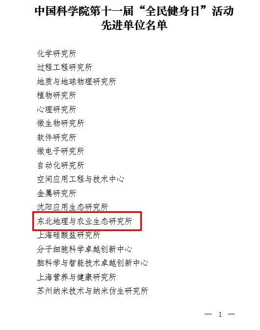 為表彰先進,樹立典型,中國科學院體育協會近日授予全院40家單位“中國科學院第十一屆‘全民健身日’活動先進單位”稱號,東北地理與農業生態研究所位列其中,獲此殊榮。
