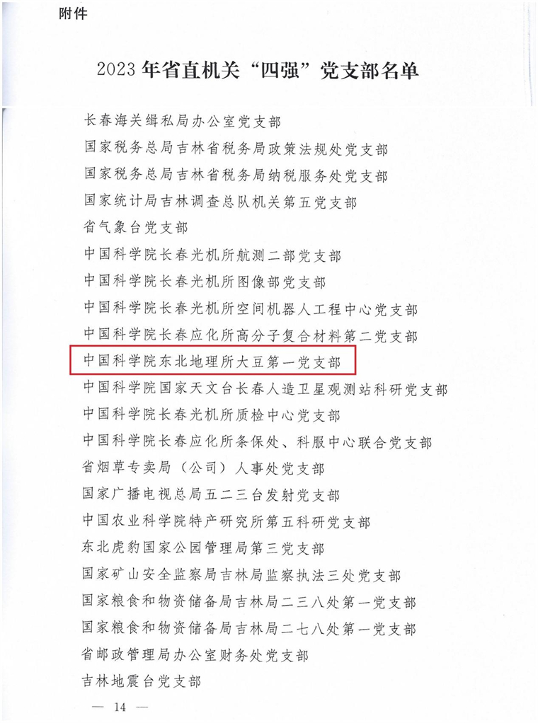 吉林省直機(jī)關(guān)工委為表彰先進(jìn)、鼓舞士氣,充分發(fā)揮先進(jìn)典型的示范引領(lǐng)作用,激勵省直機(jī)關(guān)各級黨組織和廣大黨員干部在新時代新征程展現(xiàn)新?lián)?dāng)、新作為,共命名265個黨支部為“省直機(jī)關(guān)‘四強(qiáng)’黨支部”,東北地理所大豆第一黨支部位列其中。